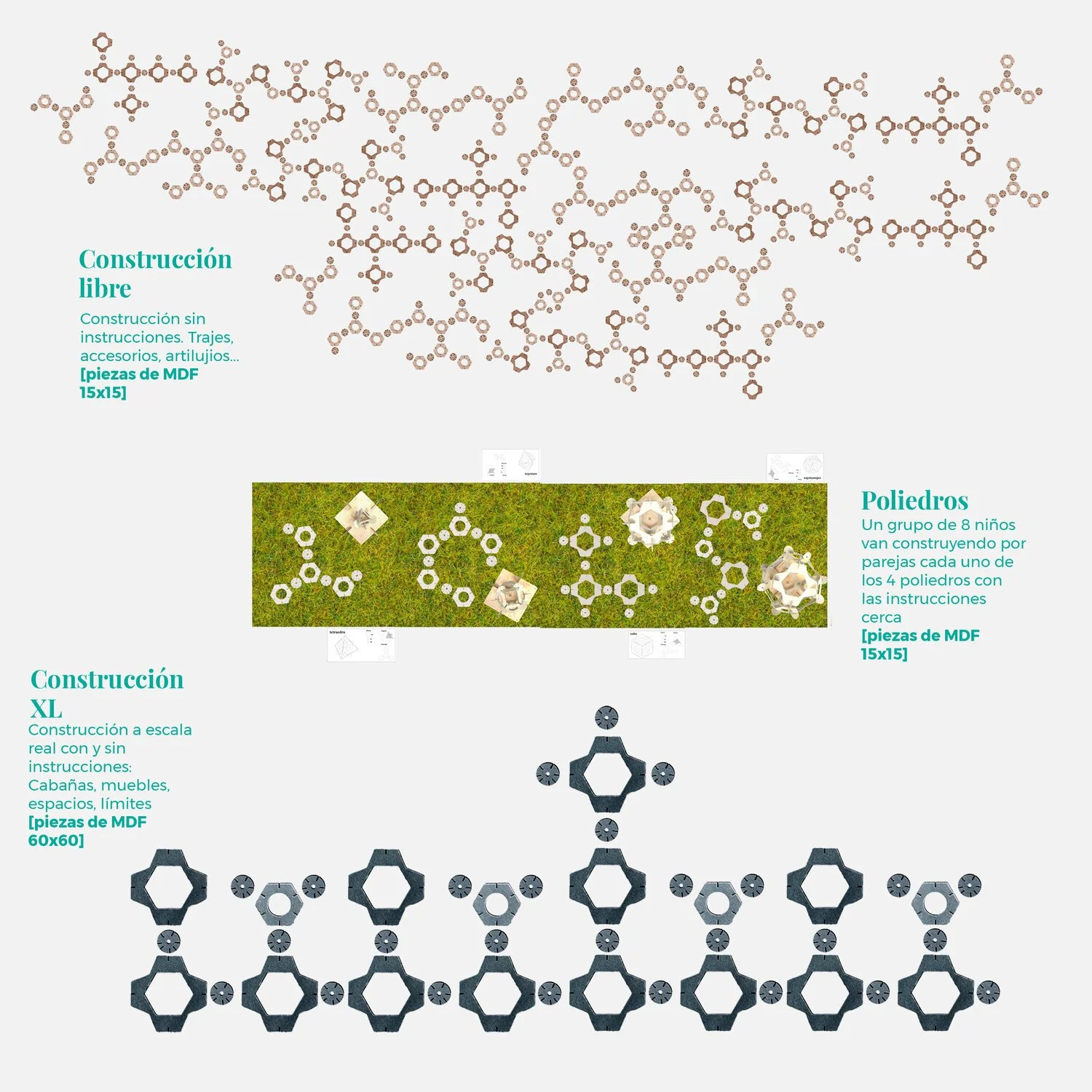 Piezas de MDF 15x15x3 distribuidas por el espacio