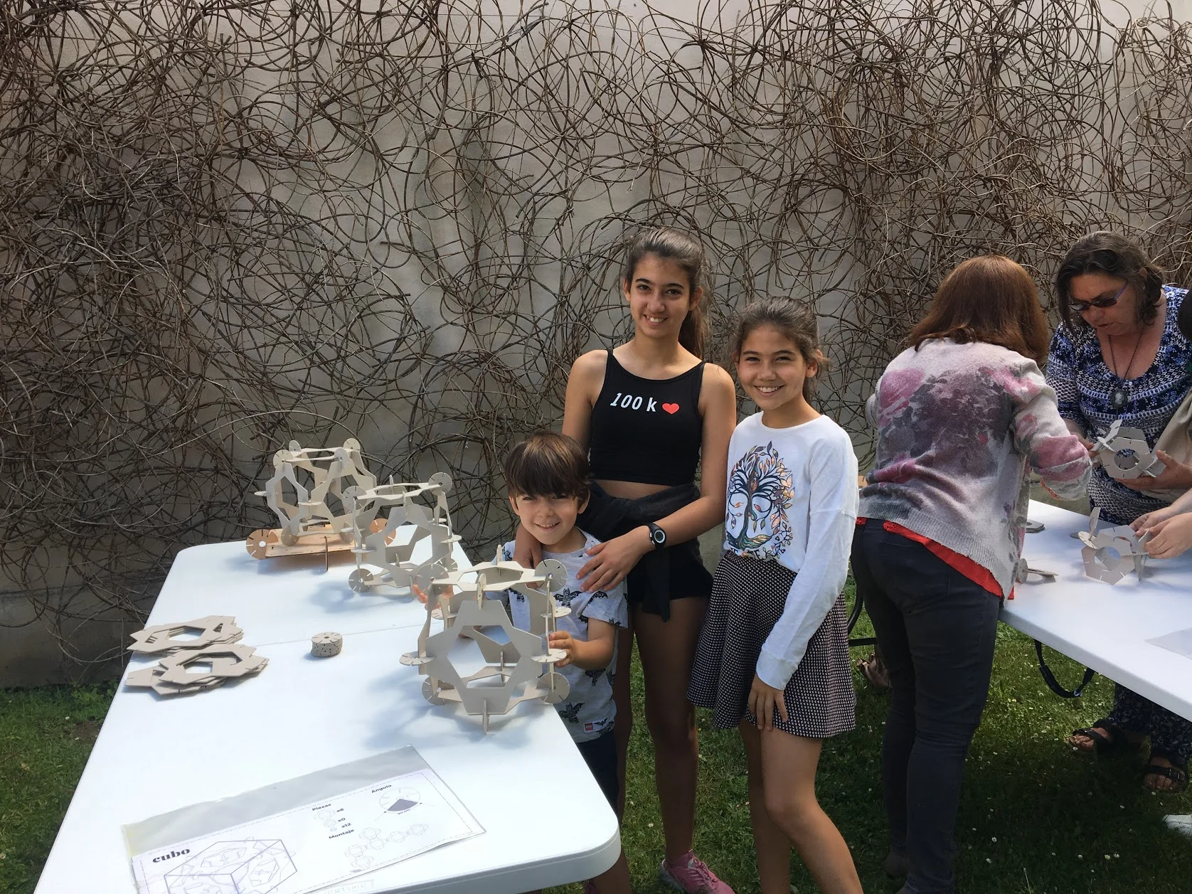 La última zona, mesas con piezas de cartón, poliedros de muestra e instrucciones... las mismas piezas que en grande construyen espacios, sin instrucciones se convierten en volúmenes espontáneos tienen su origen y una de sus aplicaciones en construir y comprender geometría regular a través del juego. Las #looseparts dejan de serlo y se convierten en un juego #stem.