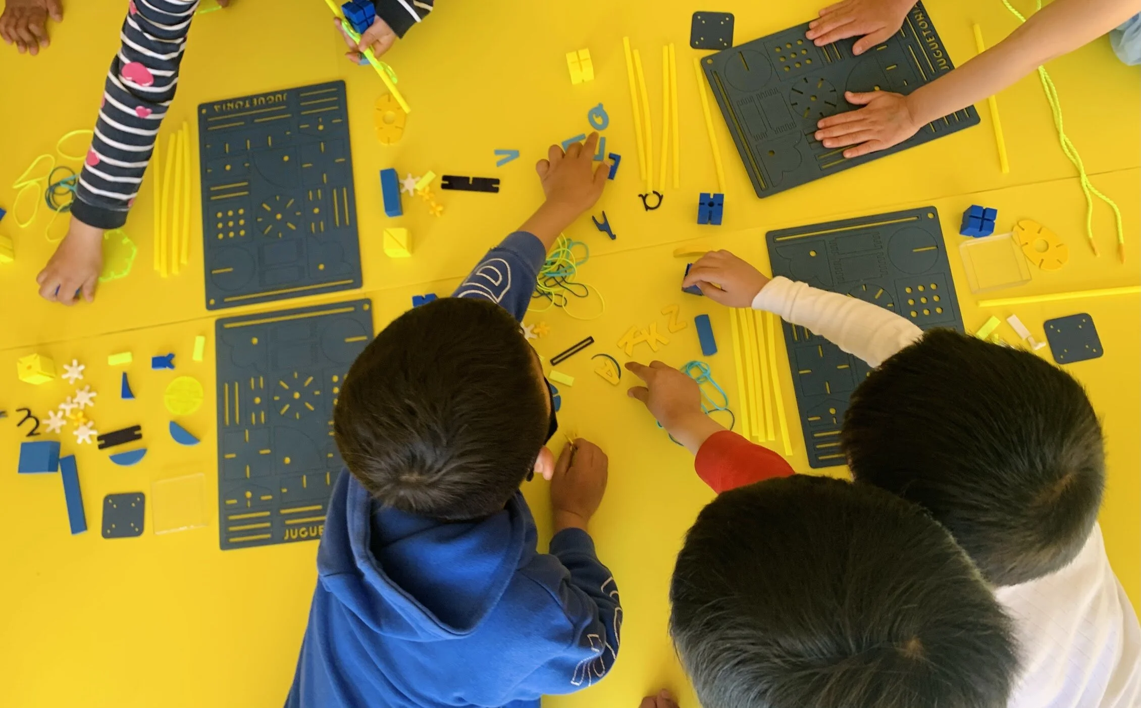Cambiamos de color las mesas por amarillo y traemos versiones de las piezas de Juguetoría en amarillo y azul. Limitamos la combinación de colores y dejamos libertad en su combinación. Empezamos a inventar juegos y juguetes jugando.