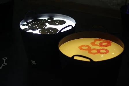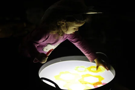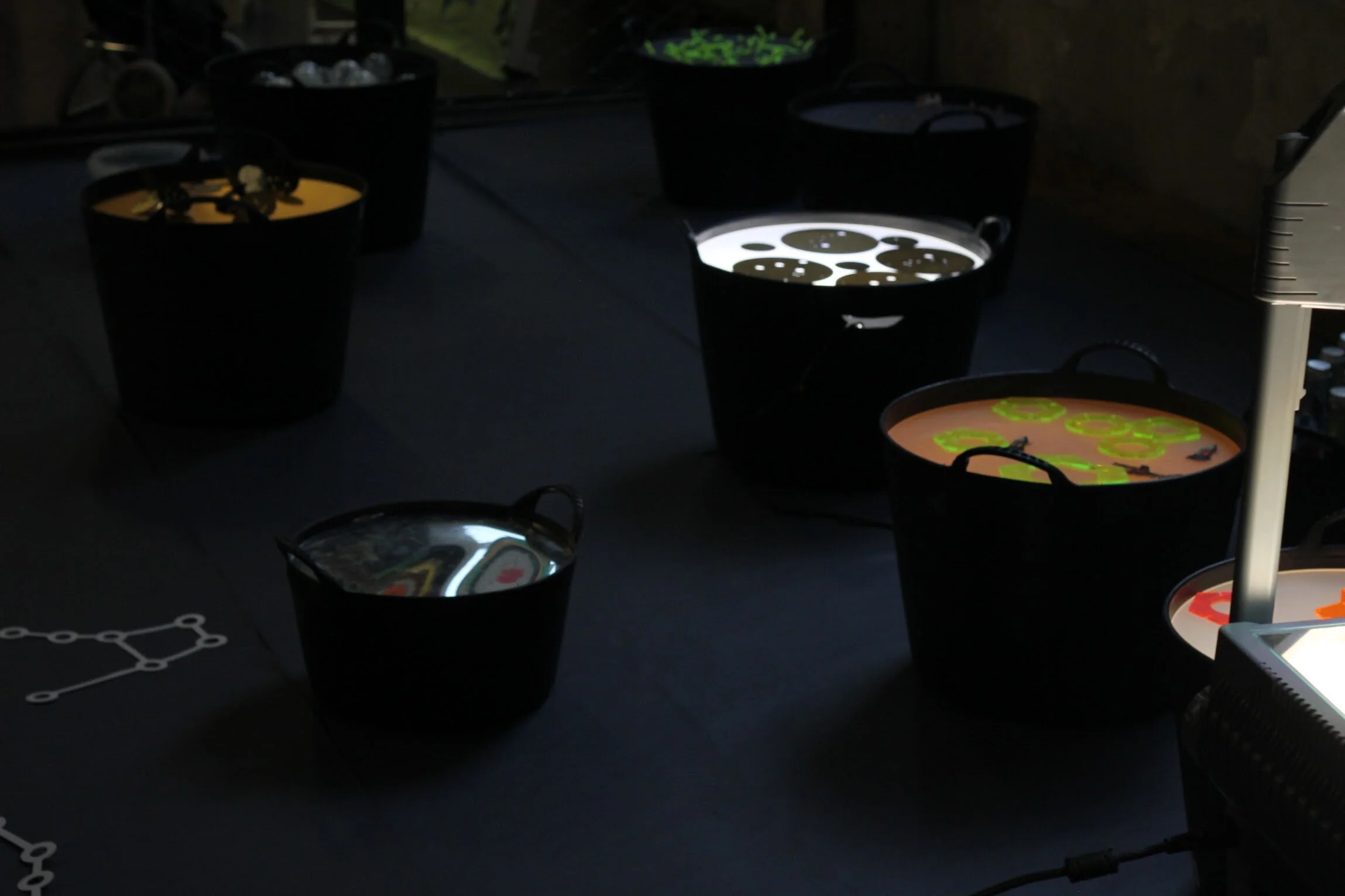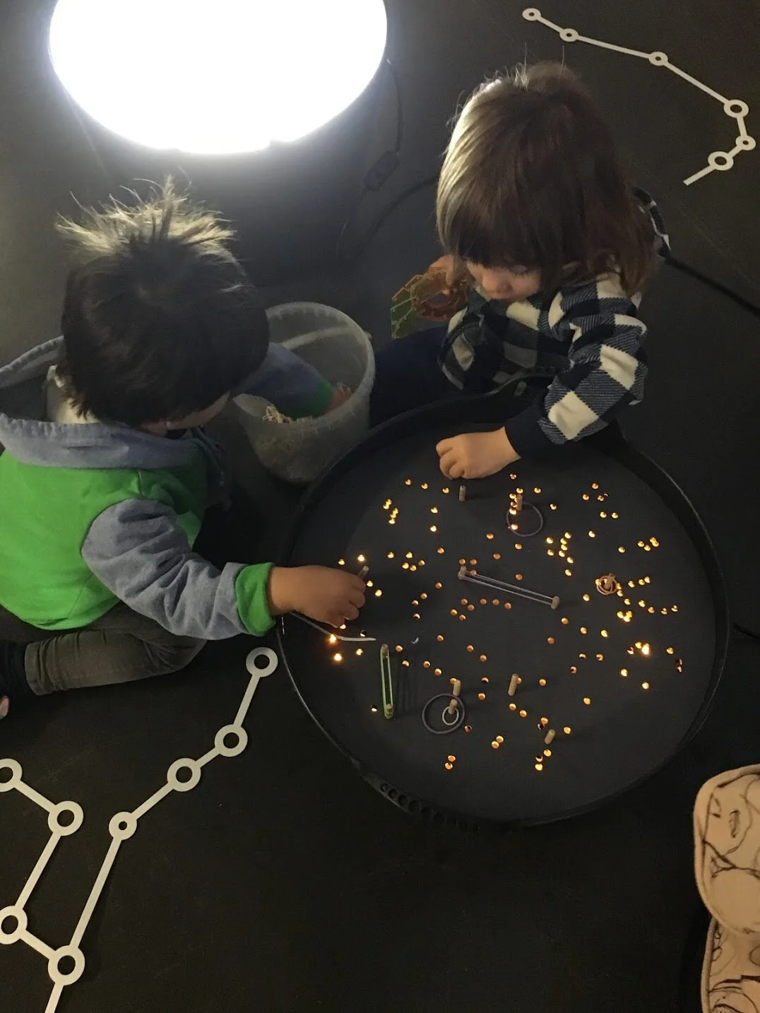 Utilicé capazos negros de los que se suelen utilizar para mezclar cemento y diseñé diferentes tapas que convertían los capazos montados en diferentes mesas sensoriales. Mesas de luz redondas, mesas espejo, mesas para insertar espigas y conectarlas con gomas formando constelaciones, mesas pizarra y algún capazo que no era mesa lleno de bolas transparentes, algunas con luz que lo convertían en una particular piscina para bañarse entre estrellas.