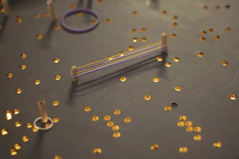Necesitaba asociar uno/ o varios objetos al proyecto y diseñé y produje algunas “piezas estelares” unas piezas doradas con las constelaciones troqueladas que dejaban pasar la luz de las mesas, hacían sombras sobre las proyecciones, que reflejaban la luz del ambiente, con las que podían construir, dibujar, componer y atesorar las estrellas en la palma de su mano.