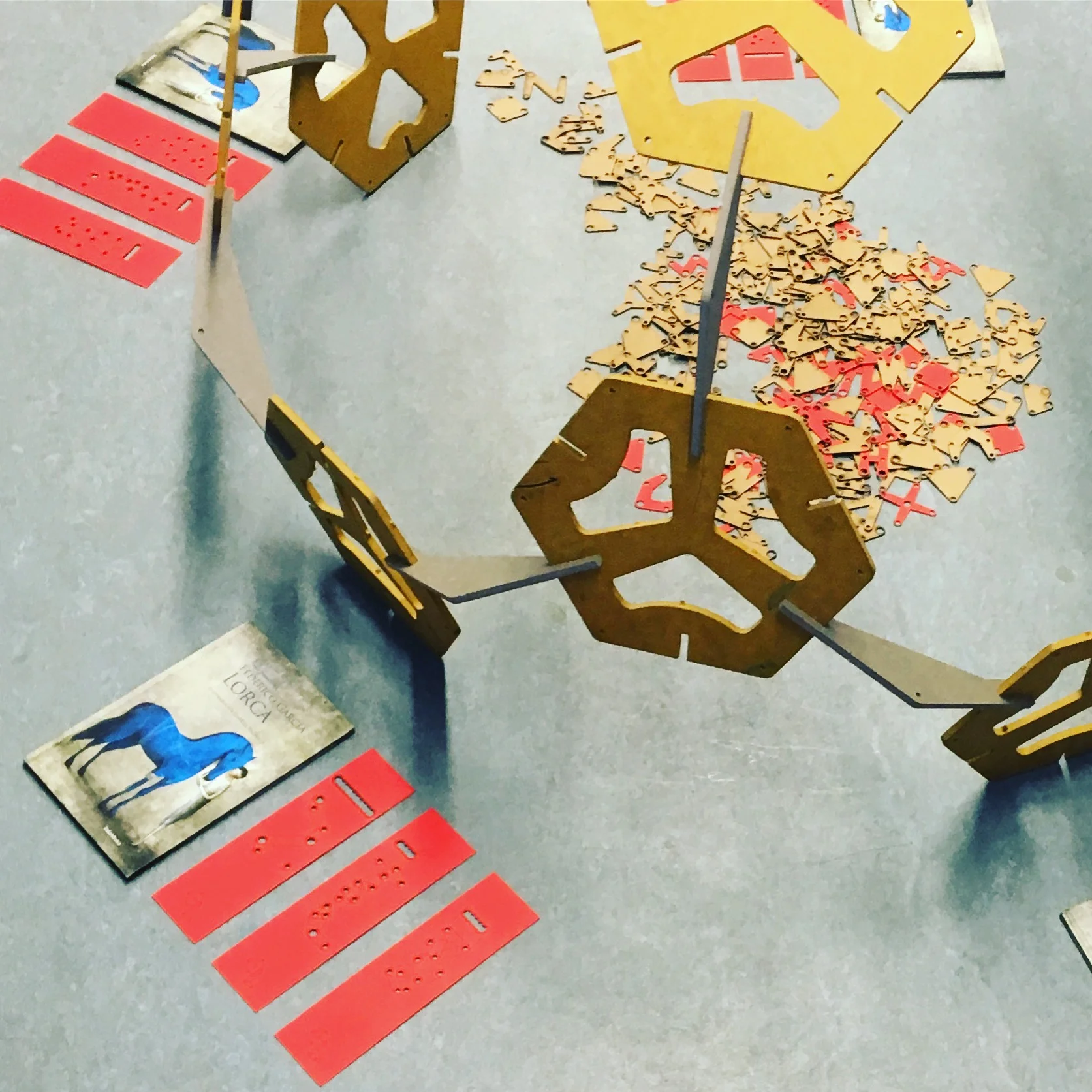 Con una serie de plantillas que enmarcan unas letras si otras no, unas palabras si otras no, unas frases si otras no...tenemos piezas que construyen letras, letras que construyen palabras y palabras que construyen frases inspirándonos en estas lecturas parciales... nombraremos personajes y lugares, enlazaremos frases para construir una historia y podremos representarla construyendo nuestra escenografía con grandes piezas de microarquitectura, nuestros muebles, o nuestros escenarios de cuenta cuentos.