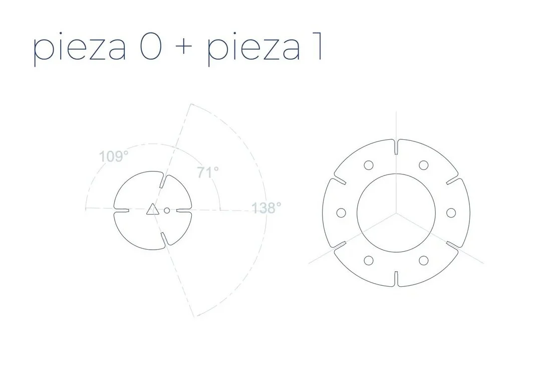 La pieza 0 contiene los ángulos de unión propios de los poliedros de caras triangulares y la pieza 1 funciona en estos volúmenes como dicho triángulo.